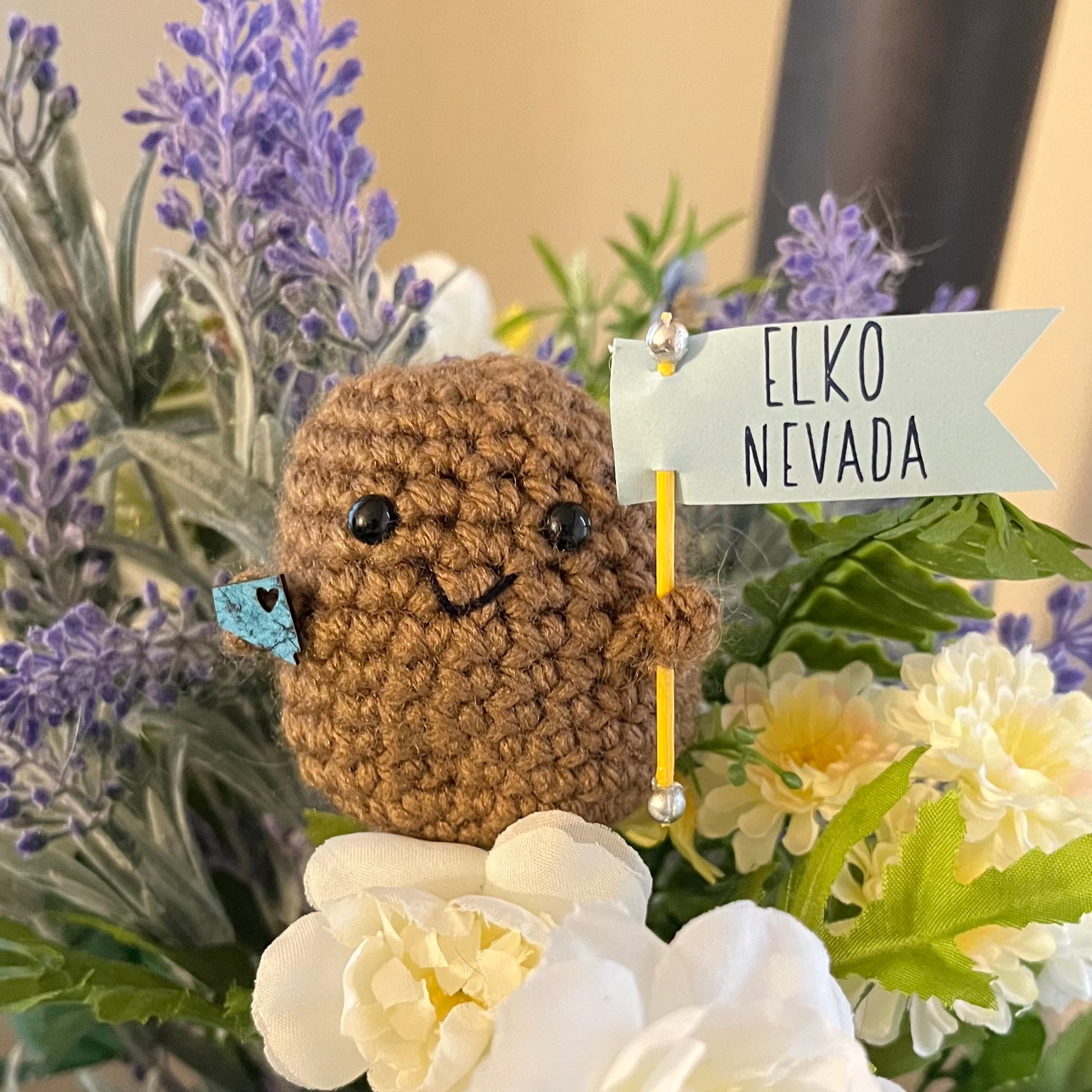 Holding a tiny Nevada with a heart showing where Elko and Spring Creek are located.